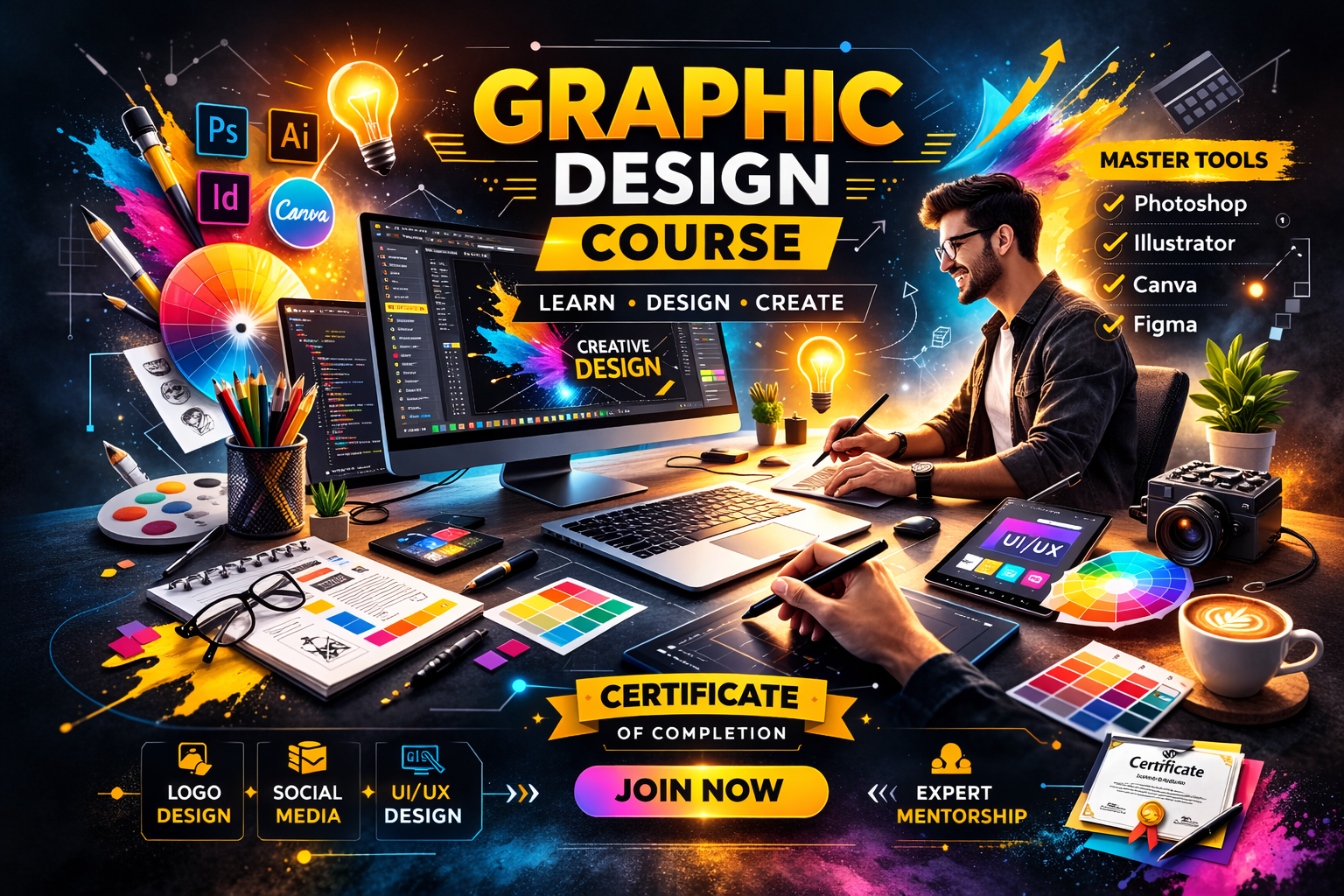 Step into the world of creativity with this bold and visually striking Graphic Design Course promotional artwork. Designed with vibrant colors, dynamic layout elements, and professional design tools, this high-resolution visual perfectly captures the energy and innovation behind modern graphic design training.